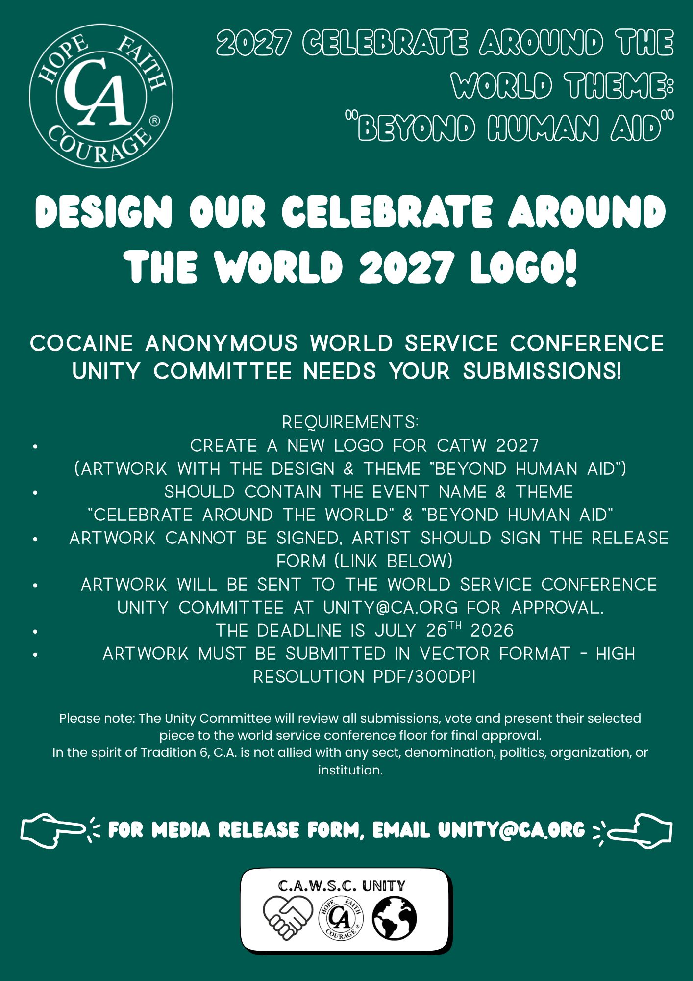C.A. needs you! The fellowship is looking for C.A.T.W. artwork for next year. It is suggested that this artwork be a global and unifying theme. Please submit all submissions to: unity@ca.org